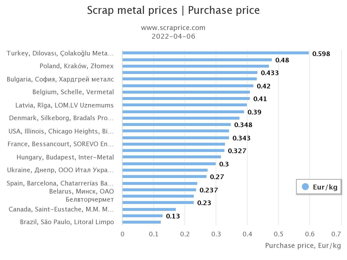 З початку 2022 року ціна металобрухту зросла приблизно на 30% і у квітні, можливо, досягла історичного максимуму. Такого дорогого металобрухту ще не було. Ціна металобрухту сьогодні (2022.04.06) досягла 590 євро/кг та вище. Найвища ціна металобрухту за даними сайту scraprice.com у Туреччині. Логічно було б зробити висновок, що за такої високої ціни металобрухту металургійні заводи різко підвищать ціни на свою продукцію та подорожчає вся металопродукція. Найближчим часом ми побачимо, чи закупівельні ціни на металобрухт зростатимуть далі, чи вже досягли верхньої межі і почнуть знижуватися.